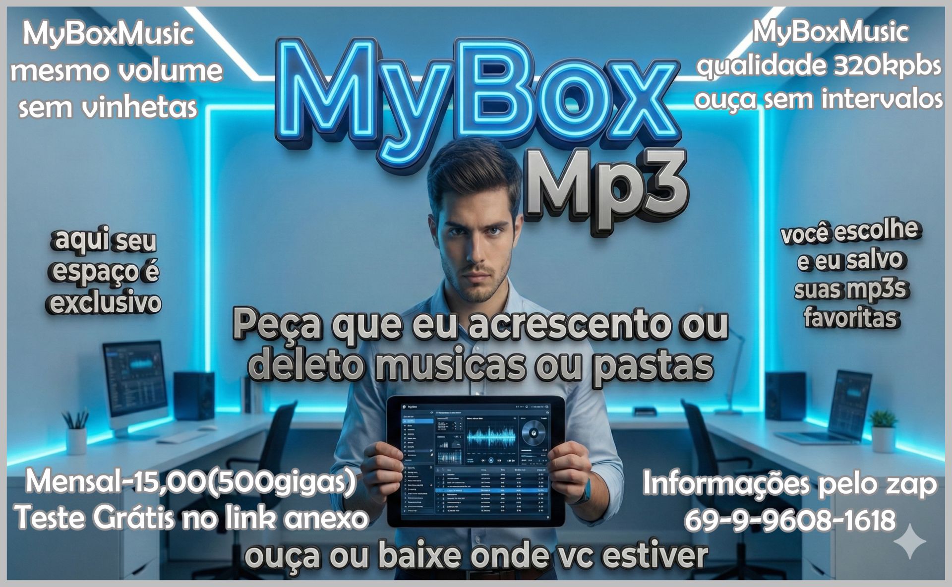 MyboxMp3! tenha uma pasta online"exclusiva com 500 gigas".Aqui VOCÊ ESCOLHE O QUE QUER OUVIR:cantores ,bandas ou ritmos.faço download com alta qualidade,mesmo volume SEM VINHETAS e Tudo salvo em pastas com faixas SEPARADAS e em Sequencias SEM INTERVALOS.ouça ONLINE quando e onde quiser,BAIXE ou revenda.Peça que eu acrescento ou deleto musicas ou pastas.O Repertório exclusivo é ideal para:Comércios,eventos,igrejas,balneários ,reuniões,academias,cerimoniais,recepções,etc.